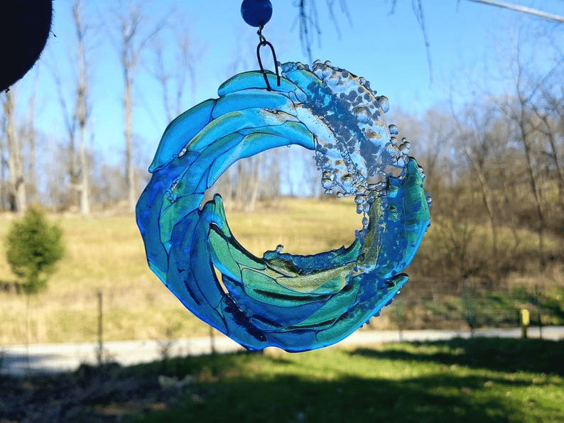 molten glass ocean catcher decoration glass wave catcher, blue wave wall-mounted, turquoise glass artwork, beach theme decoration.