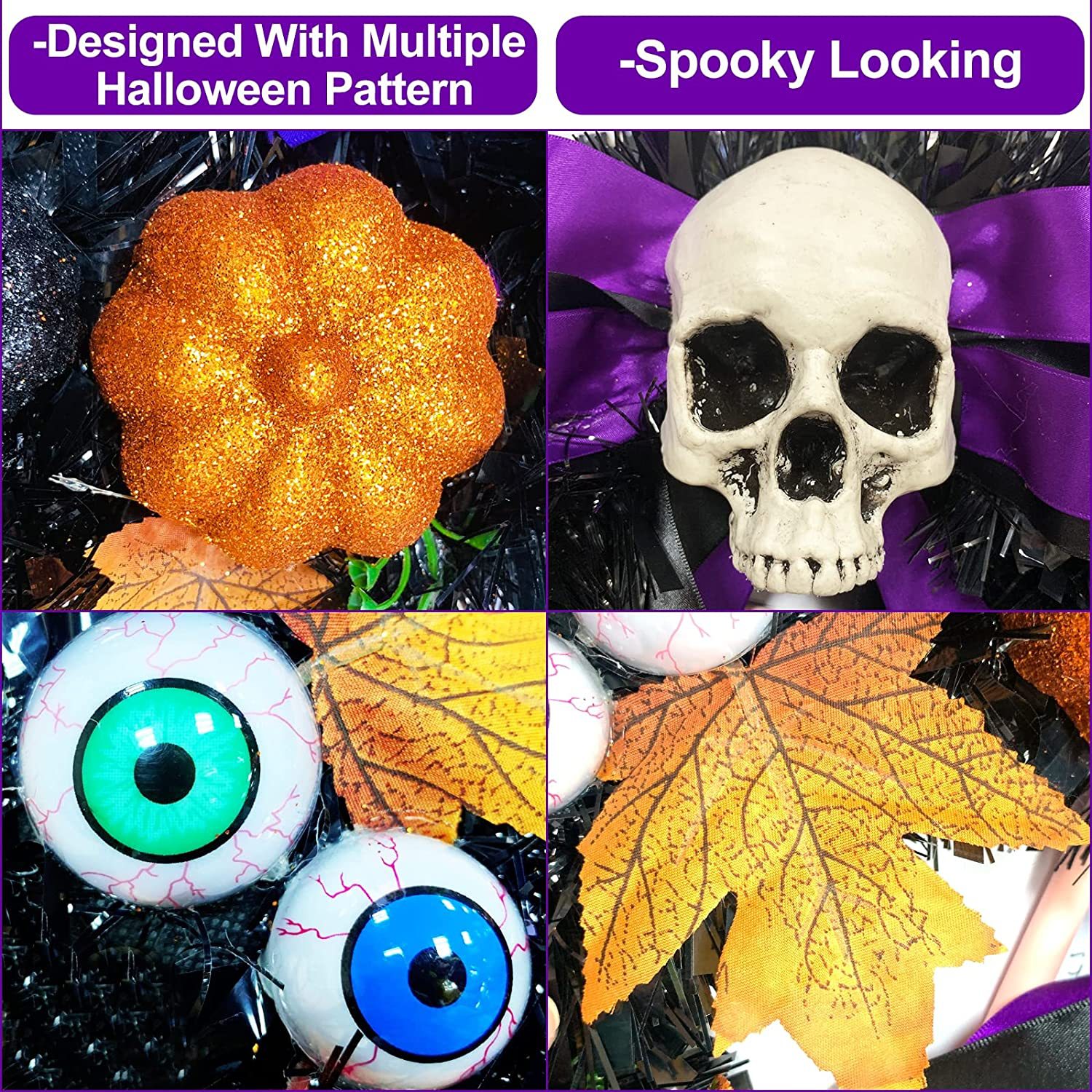 【High-quality materials】Our Halloween decoration garland uses natural grapevine substrate, which is durable and environmentally friendly. The elements are made of high-quality PU plastic, no odor, safe to use