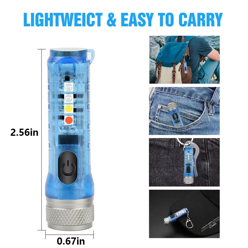 2.5inch flashlight, weighs just 18g, best for every day carry in pocket or hanging on key chain, backpack or purse without getting in the way. Addition, upgraded mini flashlight is durable and IP65 waterproof, can be used in the rain or snow, high-quality materials make this small flash light could be using for many years. This EDC pocket flashlight packs a mighty 400-lumen and a range of 150 meters, when turned on, making it be a great pick for daily using or camping lighting.